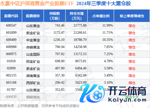 永赢中证沪深港黄金产业股票ETF为指数型-股票基金,把柄最新一期基金季报泄漏,该基金钞票建树:股票占净值比99.41%,无债券类钞票,现款占净值比0.92%。基金十大重仓股如下: